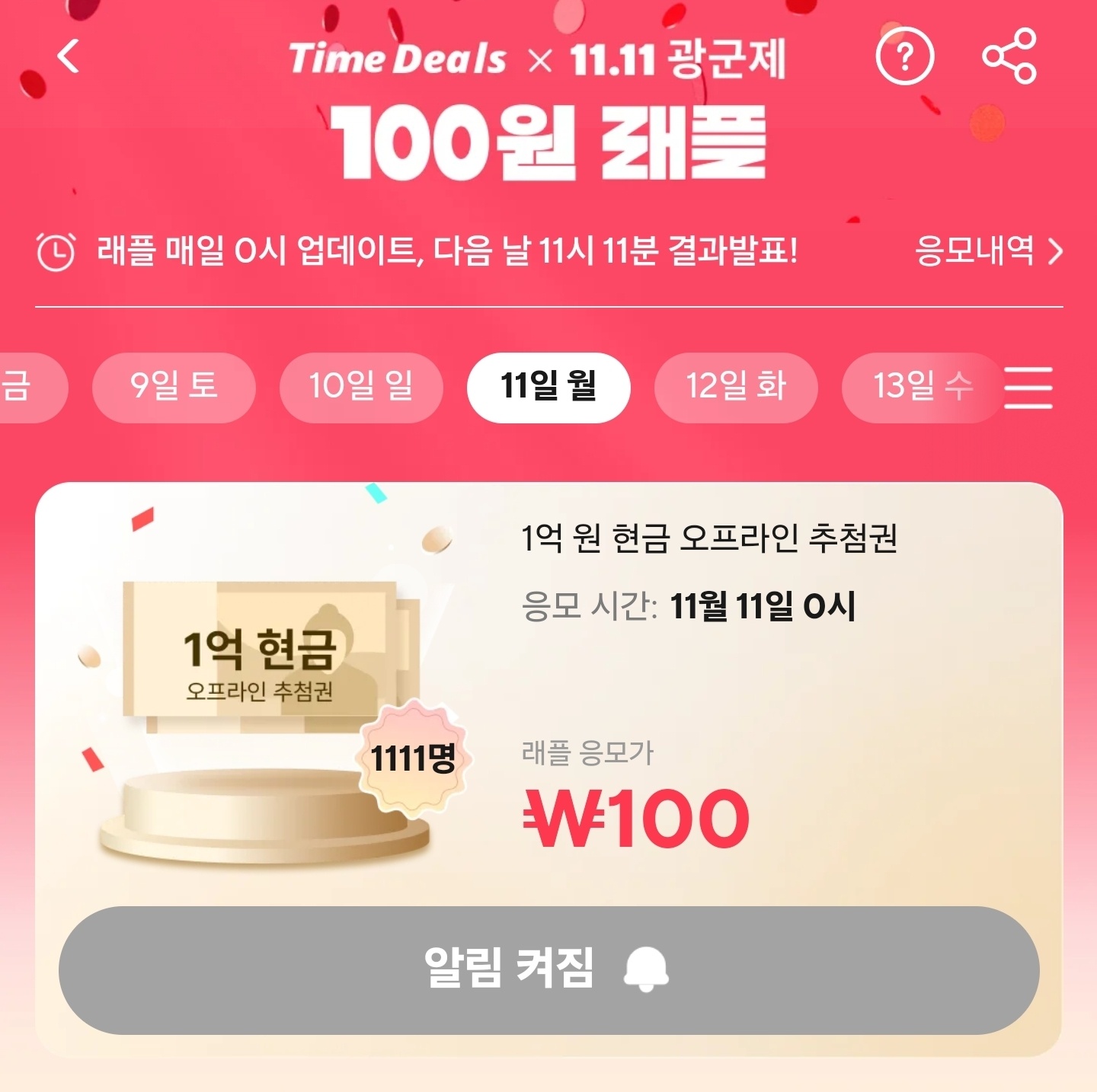 이번 광군제 세일에서는 100원 래플 이벤트도 진행됩니다. 참여 방법은 간단합니다. 알리익스프레스 앱이나 웹사이트에 접속하여 래플에 응모하면 됩니다. 매일 자정에 업데이트되며, 결과는 다음날 오전 11시 11분에 발표됩니다. 총 1,111명이 참여할 수 있으며, 1억 원의 현금 상품이 걸려 있으니 꼭 도전해 보세요!
